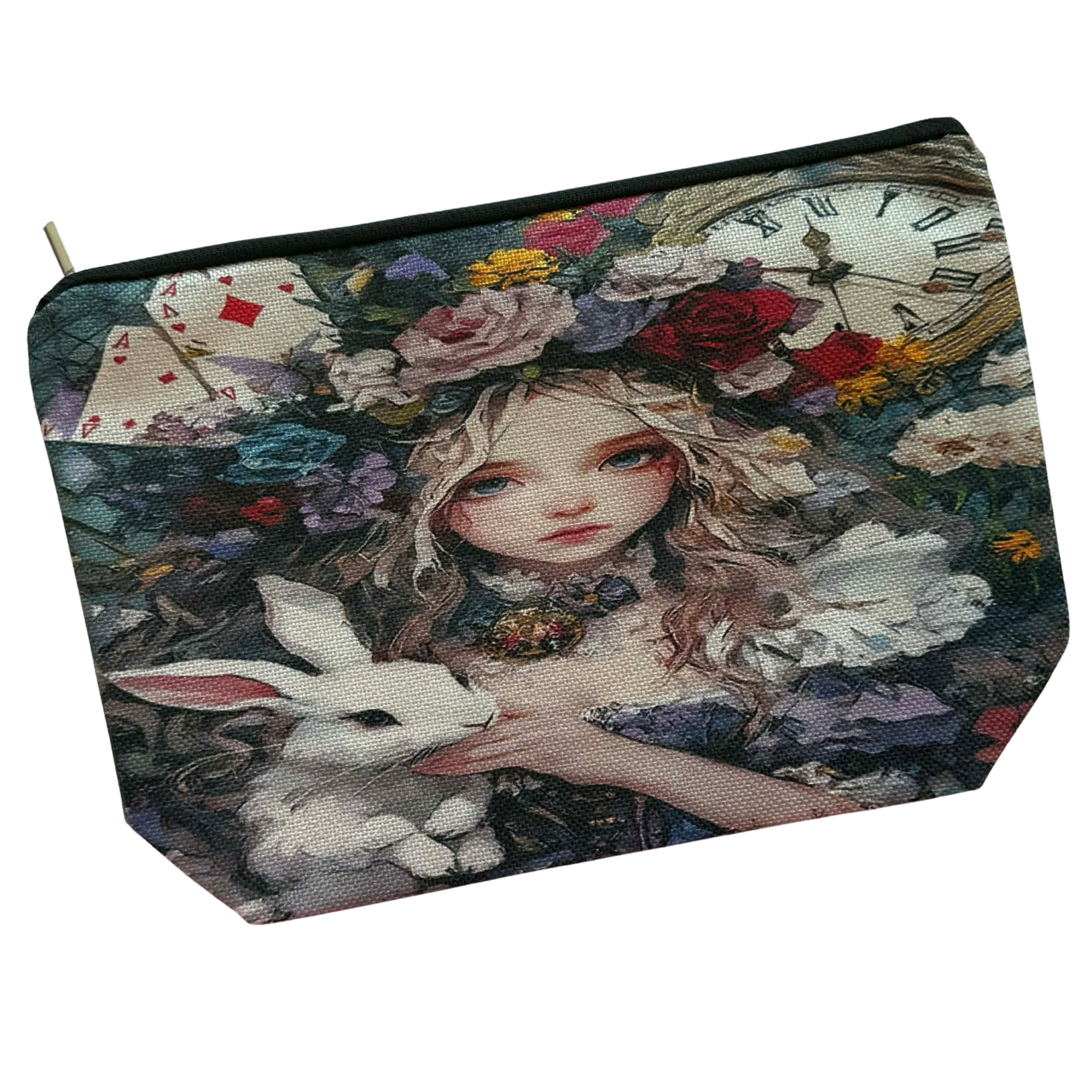 Step into a whimsical world with this Alice in Wonderland #2 Gusseted Zip Pouch, featuring a beautifully detailed design of Alice, the White Rabbit, a vintage clock, playing cards, and delicate floral elements 🌸🃏⏰